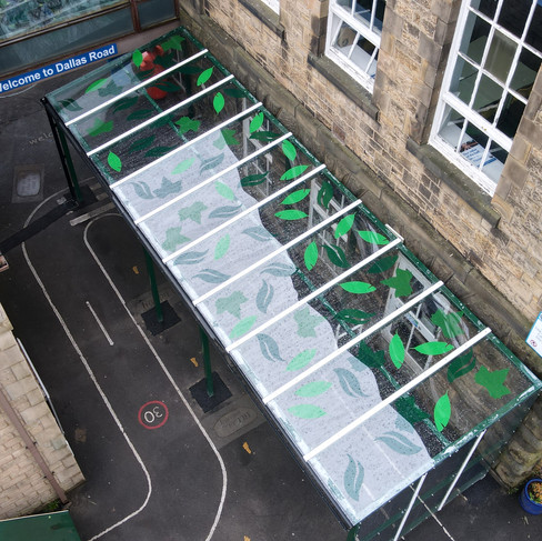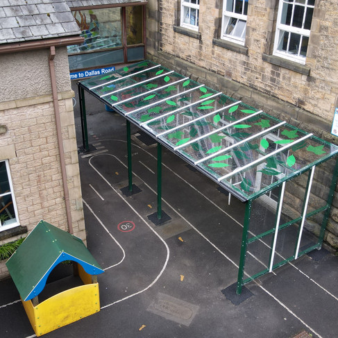 For this project, we supplied and installed a custom canopy measuring 8.3m x 2.6m, providing the ideal balance of shade and shelter for the students. The sleek green colour of the canopy was carefully selected to create a vibrant and inviting space, while the bespoke perspex roof, featuring a color-projecting leaf print, adds a creative and dynamic touch to the design. As sunlight filters through, the leaf patterns are projected onto the ground and walls of the building, offering an engaging sensory experience for the children. The design wasn’t just focused on aesthetics; we also addressed the practical needs of the school’s outdoor area. To ensure long-lasting functionality, the canopy was fitted with integrated guttering and an underground drainage system that connected directly to the existing water system. This feature effectively manages rainwater, preventing pooling and ensuring that the area remains safe, dry, and enjoyable for children throughout the year.