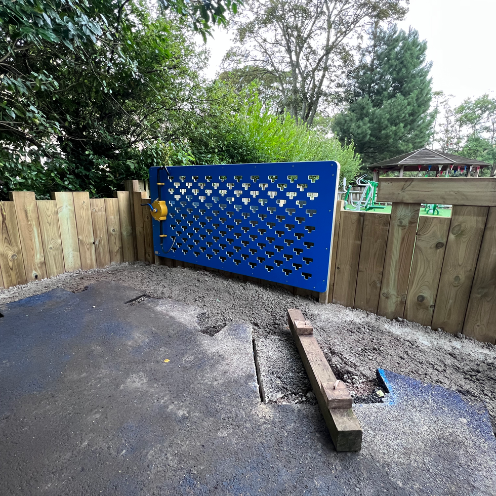 To further enhance the safety and functionality of the playground, we installed two sections of fencing with double gates, ensuring secure access while maintaining an open, welcoming feel. The fencing was crafted from heavy-duty redwood rails and pales, known for their strength and durability, providing both a robust barrier and an attractive natural finish that complemented the overall design. The dual pale fencing not only defined the play area but also added a rustic charm to the space. The gates were fitted with self-closing hinges and Pro-Safe gate latches, designed to ensure that the gates remained securely closed while offering a reliable and user-friendly entry and exit point. Additionally, we installed three sections of raised sleeper retaining walls, made from sturdy timber sleepers ranging in height from 0.8m to 1.2m. This combination of safety features and high-quality materials guaranteed a secure and well-maintained environment for the students to enjoy.